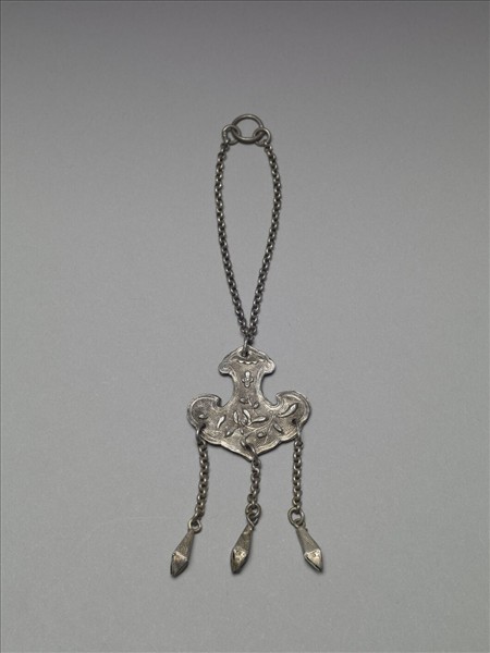 銀銅合金墜飾,頂端圓環以兩細鍊接一如意雲形飾片,飾片表面飾粟米銀珠地紋,地紋上另有花葉紋。飾片下方接有細鍊,底端各帶一四角錐形墜角,墜角表面敲飾圈點紋。