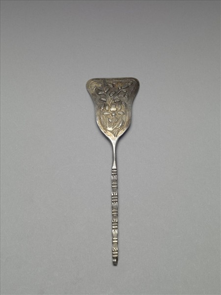 銀銅合金髮飾,簪部為芭蕉葉形,表面飾淺粟米銀珠地紋,並帶有花葉紋。挺部刻有各式短線,底端有一圓孔。