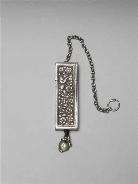 銀銅合金墜飾,主體為一中空長方形飾件,表面鏨刻折枝梅花及喜鵲,意寓「喜上眉梢」。飾片可分離為兩部份,一端接細鍊,另一端接一球形墜角。
