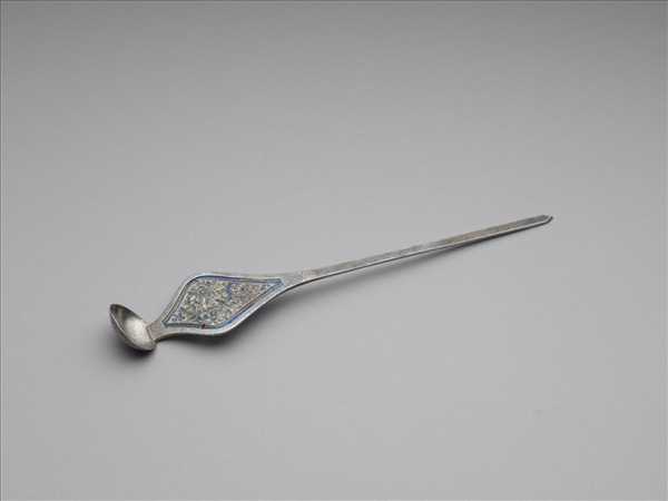 銀銅合金耳挖簪,簪首近似菱形,前端為一耳挖,簪挺扁平而上寬下窄。簪首於菱形部位表面飾花葉紋,並以藍綠色琺瑯料填滿。