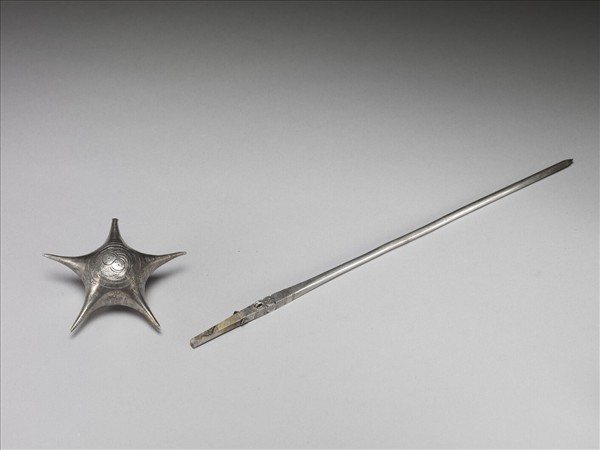 銀銅合金髮簪,簪首呈螺形,帶五突出長棘,簪挺長直。簪首中央飾由太極圖演變而成之雙魚紋、一周圓珠紋與葉紋,五棘皆佈滿弦紋。簪挺上端呈四角柱狀並帶一豎立圓環,表面鏨刻紋飾,兩截方格紋間鏨刻「卍」字,一面「□」、「艮」字。簪挺下端呈圓柱狀,周身光素。簪首與挺已分離。