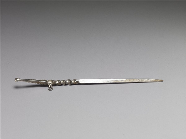 銀銅合金耳挖簪,簪首頂端為一小型耳挖,首部上端帶一截螺旋紋,紋飾上方豎立一圓環。挺部下端扁平而光素無紋。