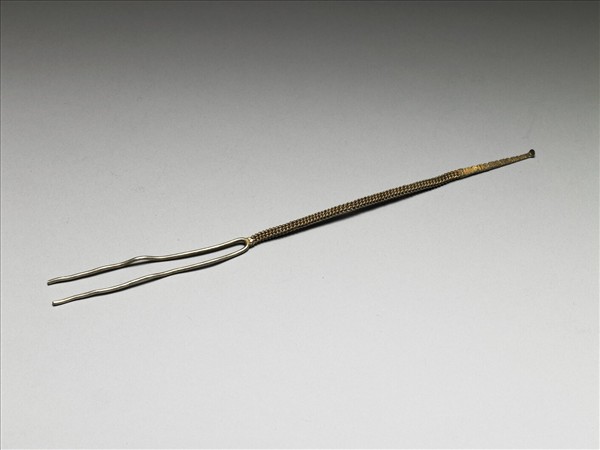 銀銅合金耳挖釵,釵首頂端為一耳挖,釵首上端鏨刻幾何紋,下端飾滿鎖鏈紋。挺部作兩釵式,周身光素無紋。