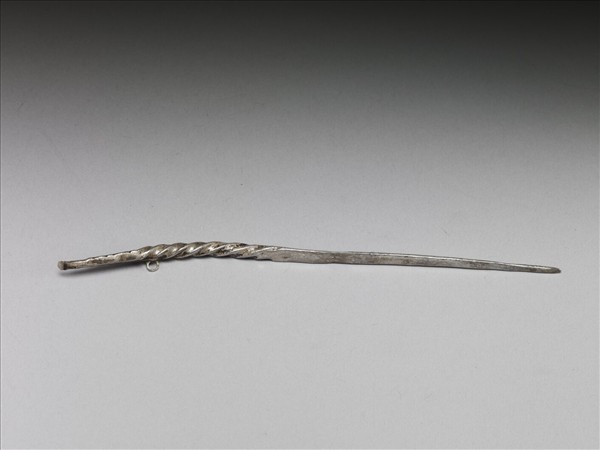 銀銅合金耳挖簪,簪首頂端為一小型耳挖,首部飾一截螺旋紋,紋飾上方豎立一圓環。挺部扁平而光素無紋。
