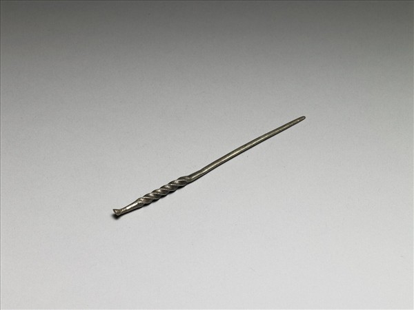 銀銅合金耳挖簪,簪首頂端為一小型耳挖,首部飾數道弦紋與一截螺旋紋。挺部下端扁平而光素無紋。
