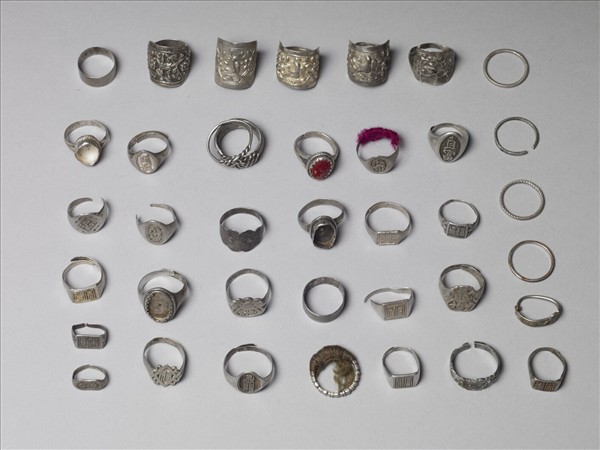 銀銅合金戒指,戒面或嵌料石、或鏨飾漢字、或以花葉紋為飾。