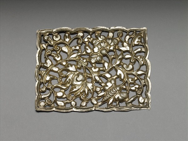 銀銅合金飾件,全器為長方形,周邊呈波浪狀並飾有一周圓形紋。其內部飾滿捲曲纏繞之鏤空番蓮花與葉紋,花葉間有一昆蟲停佇。