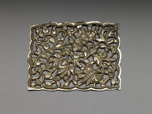 銀銅合金飾件,全器為長方形,周邊呈波浪狀並飾有一周圓形紋。其內部飾滿捲曲纏繞之鏤空番蓮花與葉紋,花葉間有一昆蟲停佇。