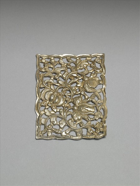 銀銅合金飾件,全器為長方形,周邊呈波浪狀並飾有一周圓形紋。其內部飾滿捲曲纏繞之鏤空番蓮花與葉紋,花葉間有一昆蟲停佇。