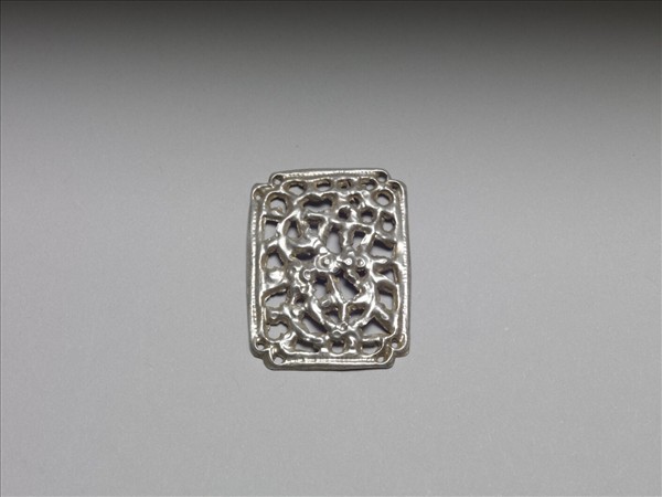 銀銅合金飾件,全器為長方形,四角各帶一凹缺,邊緣飾一周圓形紋。其內部飾滿捲曲纏繞之鏤空花葉紋,風格簡樸。
