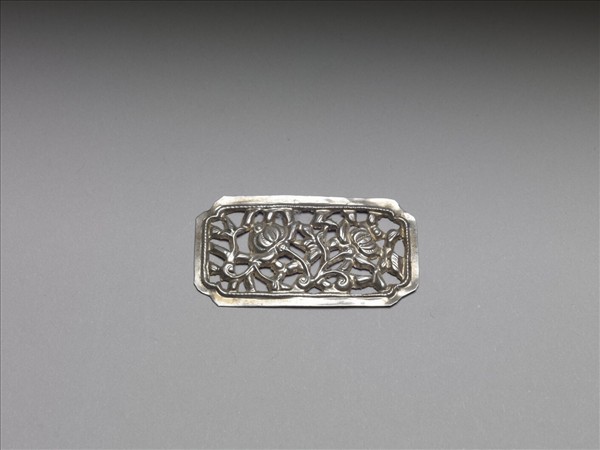 銀銅合金飾件,全器為長方形,四角各帶一凹缺,邊緣飾一周圓形紋。其內部飾滿捲曲纏繞之鏤空花葉紋。