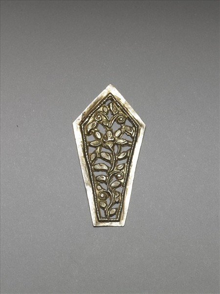 銀銅合金飾件,全器為五角形,邊緣飾一周圓形紋。其內部飾滿捲曲纏繞之鏤空花葉紋,頂端有一蝴蝶停佇。
