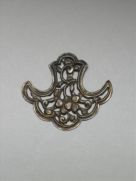 銀銅合金飾件,全器為雲紋形狀,邊緣飾一周圓形紋。其內部飾滿捲曲纏繞之鏤空花葉紋,葉脈及花瓣紋路清晰。
