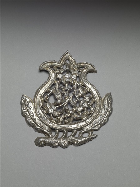 銀銅合金飾件,器身為一肥碩之石榴形貌,底部接枝葉。邊框飾雙周弦紋,中間並帶有多組四點紋。石榴內部飾滿鏤空花葉紋,葉間有兩鳥禽穿梭其中。