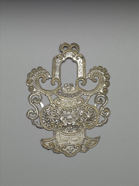 銀銅合金飾件,全器由均勻對稱之幾何紋組成複雜形狀,邊緣皆飾一周圓形紋。飾件上端兩側各帶一幾何紋飾,中央為一蓮花,花朵上方為一樑。器身中端由四幾何紋環繞而成,內部飾四朵花紋。底端為如意雲形,內部飾回紋。