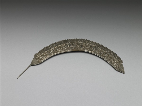 銀銅合金飾件,全器呈長條狀,器身微彎,一端接一光素無紋之短柱。器身外緣帶一排羽狀紋飾,表面中央飾一變形壽字,兩側飾轉枝花葉紋。