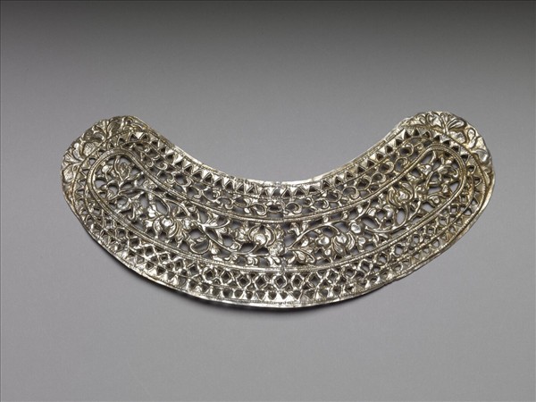 銀銅合金飾件,全器呈長條狀,器身微彎。器身皆為鏤空圖紋,邊緣為一周三角紋,內部為轉枝花葉紋。