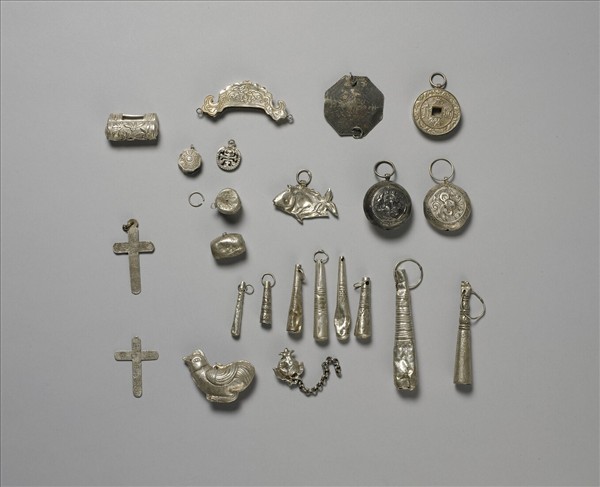 銀銅合金墜飾,種類不一,有十字架飾片,或雞形、魚形飾件與球棒狀墜飾等。部分還見金屬環銲黏其上,但都難以辨識其原來裝飾於物件上的狀況。
