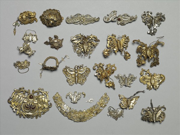 銀銅合金殘飾件,多作蝴蝶形,多以聯珠紋框廓器物外型或內分表面紋理,呈現細緻雕作的縟麗感,但難以辨識其原來裝飾於物件上的狀況。