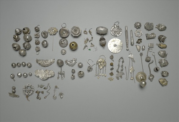 銀銅合金殘飾件,種類不一,數量甚多,或鈴鐺、或果實飾件,或雞形飾件與球棒狀飾件等。部分還見金屬環、鍊條銲黏其上,但都難以辨識其原來裝飾於物件上的狀況。