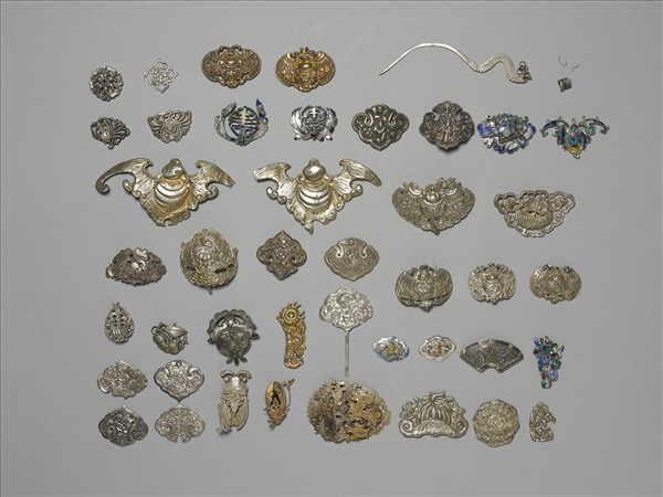銀銅合金殘飾片,種類多樣,或昆蟲,或蝙蝠,或蝴蝶,或花朵,亦有以文字裝飾者,部分見以彩料點翠,但都難以辨識其原來裝飾於物件上的狀況。