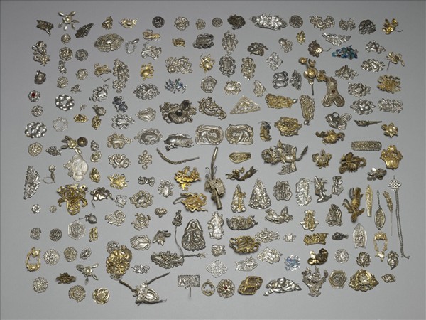銀銅合金殘飾片,種類多樣,或仙道,或佛道用具,或龍或魚,部分還見金屬鍊條附件黏其上,但都難以辨識其原來裝飾於物件上的狀況。