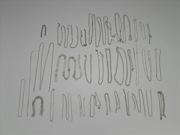 銀銅合金殘飾件,多為金屬鍊條,大小長短不一,多見殘損,其中一個錢幣形墜飾仍存,其他鍊條原有墜飾均已失。