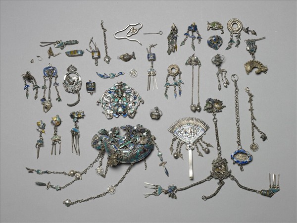 銀銅合金殘飾件,種類多樣,但多於器外壁飾藍、綠、黃等色琺瑯,為白的色調增添華貴。