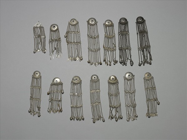 銀銅合金墜飾,樣式較統一,除一件是以三角形飾片接鍊條外,其他皆以圓形飾片連接金屬鍊條為飾,鍊條以金屬飾件並聯,下帶葉形墜角。