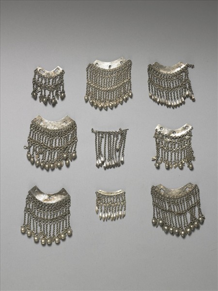 銀銅合金墜飾,樣式較統一,除一件飾片已失外,其他多作扇形飾片下接金屬鍊條而成器,鍊條下或帶菱形飾件、或以含苞花為墜角。