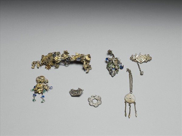 銀銅合金飾殘件,多為金屬飾件,除了點翠花葉金屬飾件外,還見有外壁鏨飾花葉紋的花形飾件,以及帶細鍊與墜角的「太平通寶」圓錢式飾件。