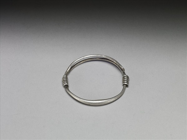 銀銅合金手鐲,整器由金屬條製作而成。中段粗,兩端細,外壁光素無紋。金屬條彎折為環形而成器。器身上有緊密螺旋纏繞器身金屬片,可固定、調整環徑的大小。又由其兩側對稱的位置看來,或又作為裝飾。