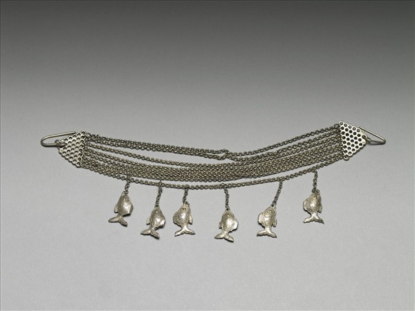 銀銅合金腰飾,整體主要將兩塊三角形金屬片以細金屬鍊連結而成器。金屬片表面鏤空等距細密的圓孔,使金屬片猶如這些圓點接連鋪衍為金屬片。一側鍊條上接連六魚形墜角。本器因金屬鍊細長,若佩於身上,將隨人體的動作而有擺動的美感。