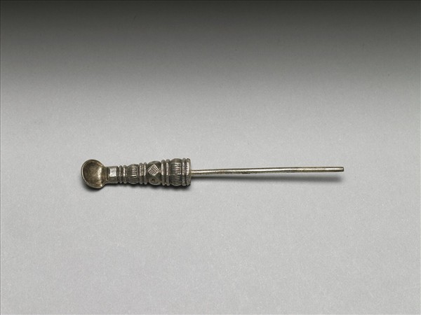 銀銅合金髮簪,圓挺光素。簪面如塔,形如幾何形物件漸次往上堆疊而成型,主要分三層,每層以兩圓弧直楞隔開,第一層與第三層為扁圓形金屬物件,外表滿布直楞,中央一層為多面體,其簪面最頂端則如湯匙。