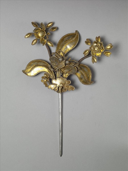 銀銅合金髮簪,素挺尖首,挺面似有漢字印記,但因簪面遮掩,難以辨認內容。簪面以三長形葉片為主體,葉間歧出二彈簧,彈簧分別接一盛開花朵,整體花形如水仙。花瓣葉片外廓多以絞絲紋裝飾,且簪面整體又罩以金色,表現富麗的裝飾情調。其上原有蝴蝶飾件,今已斷損。