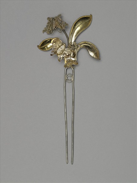 銀銅合金髮簪,素挺雙股。簪面以三長形葉片為主體,葉片分向左右與上方折曲,葉間歧出一彈簧,彈簧接蝴蝶飾件,左葉面亦有一蝴蝶為飾。花瓣葉片外廓多以絞絲紋裝飾,且簪面整體又罩以金色,表現富麗的裝飾情調。