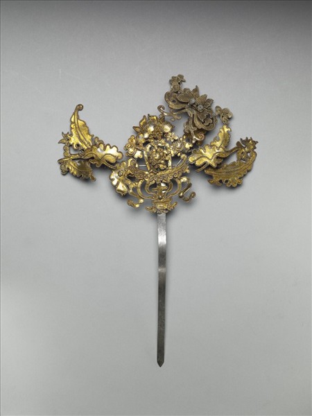 銀銅合金髮簪,素挺尖首。簪面以盆花為主調,中央一朵盛開,下方及兩旁散見小花,一隻蝴蝶正從右方飛來。又左右兩邊各蔓生出不成比例的大葉片,葉片翻轉彎折,相當搶眼,使靜態的花朵增添動態的蓬勃生氣。