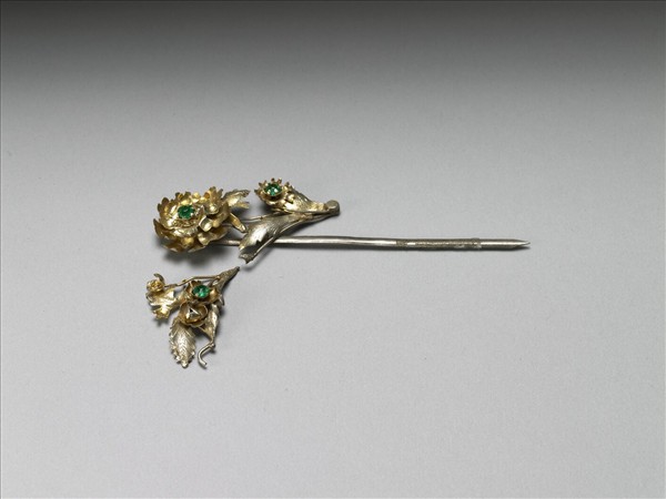 銀銅合金髮簪,素挺尖首。簪面作花卉一叢,最下兩葉間小花一朵,向上為最顯眼之大花,復於左側歧出一枝,其上亦見花葉。簪面上最主要的三朵花皆作正面盛開,花心綠色玻璃,與金色的簪面構成耀眼富麗的效果。