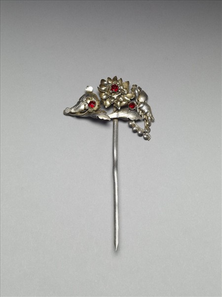 銀銅合金髮簪,素挺尖首。簪面作花卉一叢橫擺,最下兩葉間小花一朵,向上為最顯眼之大花正面開放,右側岐一葉,葉上一獸似正取用果實。花心紅色玻璃,顯眼富麗。