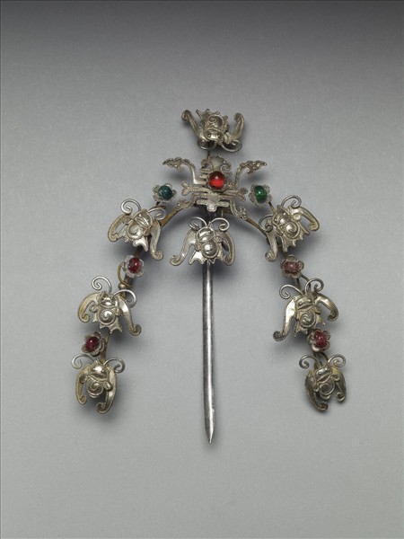 銀銅合金髮簪,素挺尖首。簪面正中一「壽」字,上下方各有蝙蝠一隻。「壽」字兩側弧下一金屬條,金屬條上等距銲黏蝙蝠與小花為飾。花心分別以紅、綠色玻璃裝飾。其蝙蝠與「壽」字,分別含有「福」、「壽」之吉祥寓意。