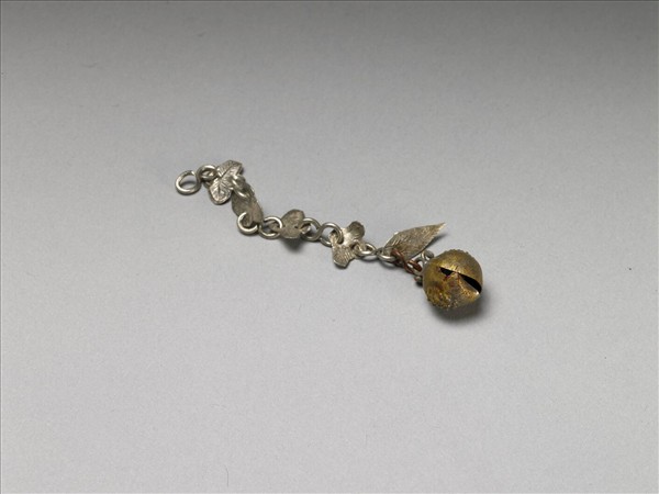 銀銅合金金屬飾件,整器為一金屬鍊條,鍊條一端接如果實狀之金屬飾件,鍊條上接飾金屬葉片。本物原始功用不明,或非整器。
