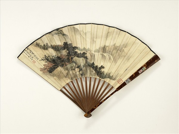 民國吳湖帆畫秋山晴靄沈尹默行書七言律詩 成扇 吳湖帆畫秋山晴靄