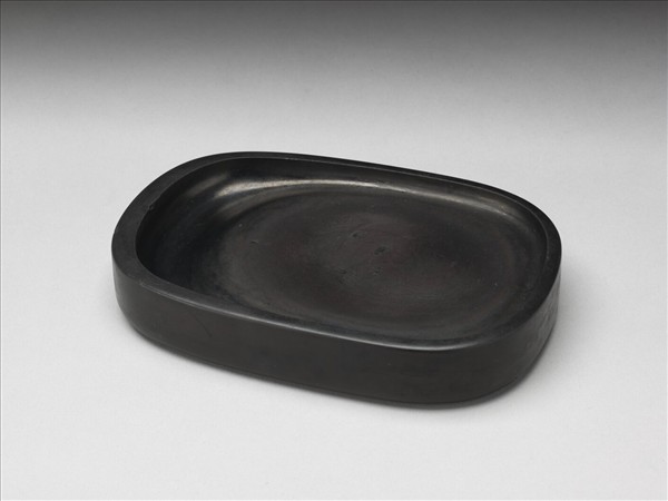 深黑色石硯,硯作長方橢圓式,邊緣平直,四角打磨渾圓。硯面周緣起棱,硯堂平整,帶偃月形池。硯背平整,刻詩文:「不見紫雲,重見紫雲,摩娑久之,松麝氤氳,奉侍何必石榴裙。 維崧珍賞」。附一深棕色帶蓋木盒,器形依隨硯身打造而成,全器平素無紋。