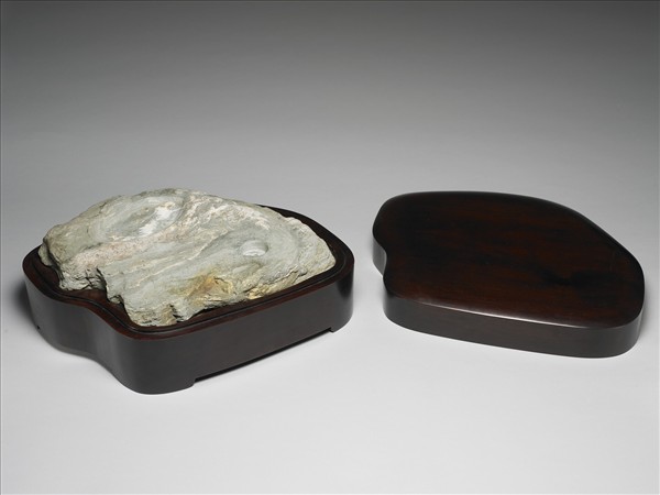 淺灰色石硯,多處摻異色雜斑。硯身略長,呈不規則形,一角帶一小型圓凹洞,另一端淺鑿一圓硯池。此硯隨附一深棕色木盒,帶蓋,器身光素無紋。
