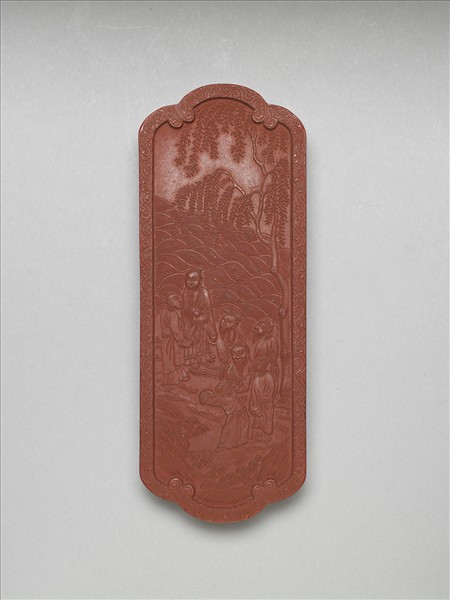 朱紅色,長方形上下接如意雲頭狀。框邊起棱,棱面滿飾雲紋,一面模印五位老者與二子及河流、柳樹等紋飾。七人聚集於水邊互相交談狀,當即描寫堯舜同遊,後遇五老於水邊的故事;一面有「御墨」、「乾隆丁巳年(二年,1737)製」,並模鈐「五老告河」四字雙行篆字,外框方框。