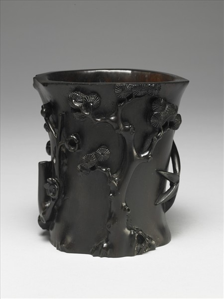 紫檀製筆筒,直筒式,口微向外捲,腹微向內斂,器外壁鏤空雕松、竹、梅,喻「歲寒三友」之意。