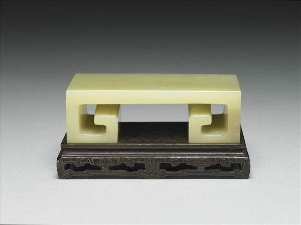 淺黃綠玉製墨床。全器雕琢成几形,雙足朝內捲。器表拋磨光滑,無紋飾。附一深棕色木座,足間之欄飾幾何紋。