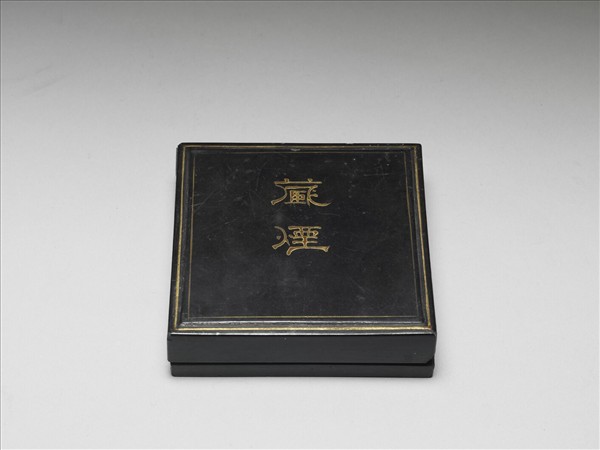 方形黑漆盒,盒蓋中央上方陰刻隸體填金「藏煙」二字,盒蓋四邊有棱,內外有金漆框邊,內存龍香神妙墨四錠(贈文000029N000000000-贈文000029N000000003)。