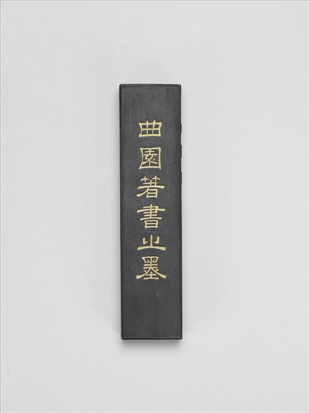 長條形墨,四邊有棱,一面中央有填金陰文「曲園著書之墨」,模印陽紋一人於園中書寫狀,園中有湖石、芭蕉,側面有楷書陽文「尺木堂」。與贈文000030N000000000、贈文000030N000000002~贈文000030N000000003同儲一木盒中。