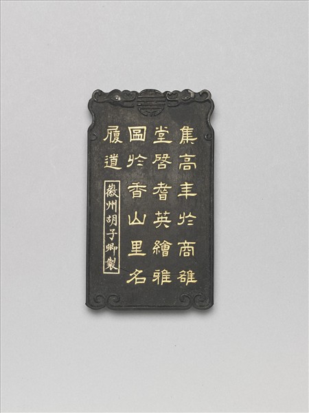 近長方形墨,以模印製作圖紋,上方中央為圓壽字,兩側為夔首,夔身向兩側延伸而下至底部,雙尾相連,形成邊棱,一面有填金隸體陰文「集高年於商,雒會啟耆英,繪雅圖於香,山里各履道」,及楷體「徽州胡子卿製」方框款;一面左上方有填金草體陰文「睢陽五老」,中央畫面中模印一人捻鬚回首,一人持仗隨後,兩者作對談行走狀。睢陽五老是北宋仁宗時睢陽當地五位德高望重的致仕官員:太子太師致仕祁國公杜衍、禮部侍郎致仕王煥、司農卿致仕畢士長、兵部郎中致仕朱貫、駕部郎中致仕馮平,五位耆年歸鄉後,由杜衍為首於暇日集會,賦詩酬唱,為五老之會,為當時人所仰慕,繪為圖畫以紀其勝,成為畫題之一。本墨為(睢陽)五老圖墨之一,與贈文000032N000000000~贈文000032N000000001、贈文000032N000000003~贈文000032N000000004為一組共儲一盒。